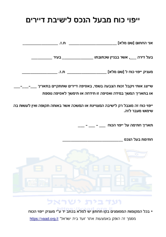 במכתב הזימון כדאי להדגיש במפורש: מי שאינו יכול להגיע מוזמן למנות מיופה כוח בכתב, כולל שוכרים שרוצים להשתתף ולהצביע.