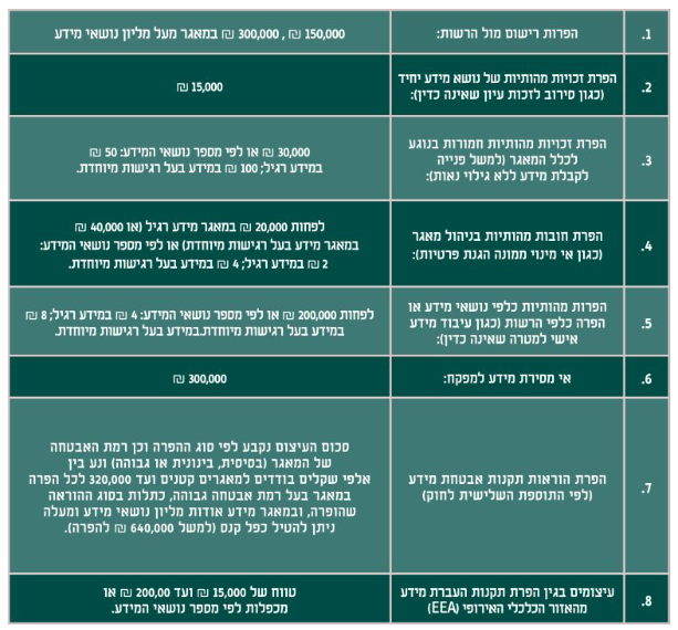 - התיקון מרחיב את הסמכות של הרשות להגנת הפרטיות להטיל קנסות, ומרחיב את האפשרות של אזרחים לקבל פיצוי ללא הוכחת נזק במקרים של הפרות.