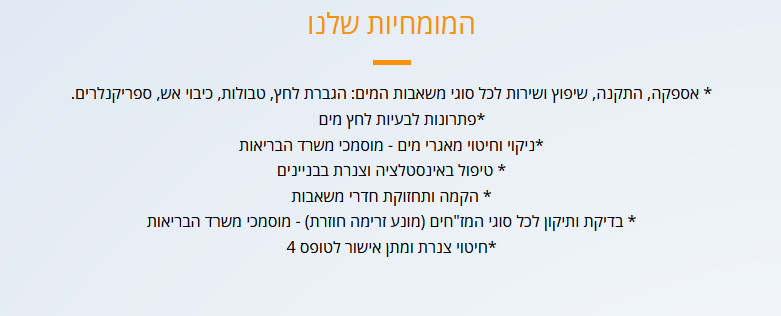 שירותי החברה כוללים חיטוי וניקוי מאגרי מים באישור משרד הבריאות, ואישור לטופס 4.