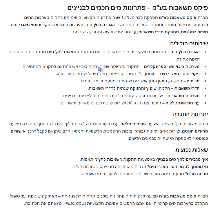 פיקס משאבות בע"מ נתפסת ברשת כחברה מקצועית, אמינה ומומלצת, במיוחד בשוק תחזוקת מערכות מים וניהול מאגרי מים בבניינים ומוסדות.