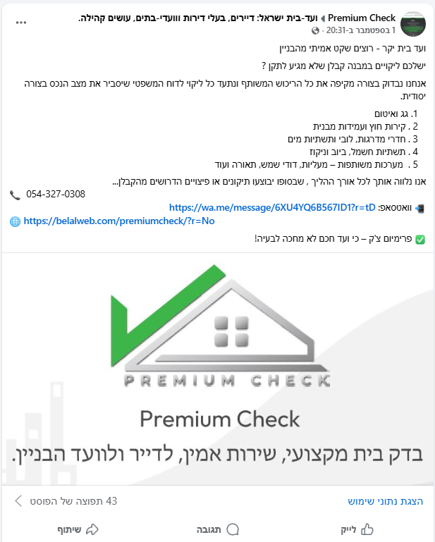 עם פרימיום צ'יק תוכלו לישון בשקט בידיעה שהנכס שלכם נבדק ביסודיות, והזכויות שלכם נשמרות עד הסוף.