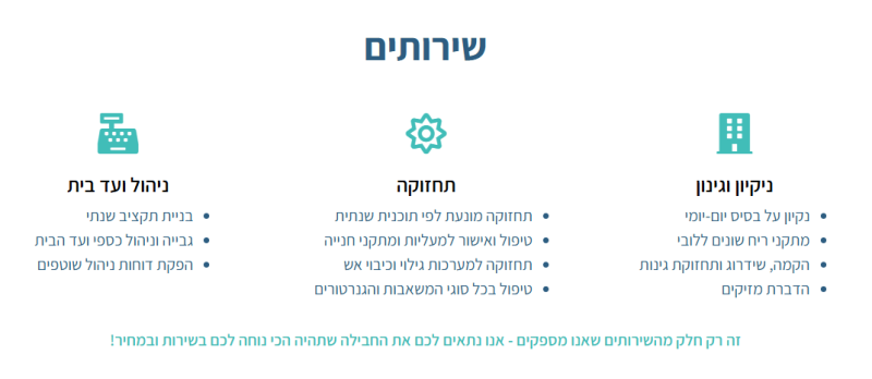 החברה מספקת מערכת שירותים כוללת לניהול ואחזקה שוטפת של בנייני מגורים, מסחר ותעשייה.